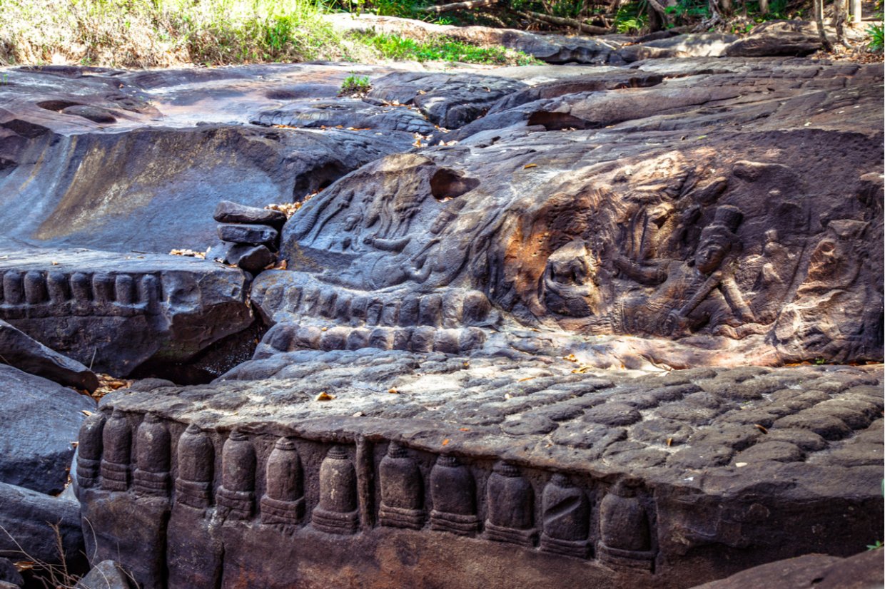 在荔枝山上能欣賞到滿山的綠意與壯闊的兩道瀑布,而在河床底下有著象徵男女生殖器的海底浮雕,附近還有一座離地有二十公尺巨大的砂岩臥佛,而荔枝山上砂岩也是龐大的吳哥寺廟群的建筑材料來源地,對於吳哥王朝有舉無輕重的地位。